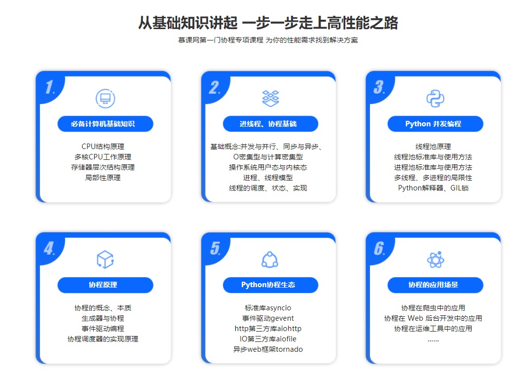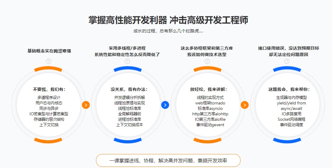 作为市面上凤毛麟角的协程专题课,课程将从基础讲起,与应用原理联动,结合丰富的课程案例,使用python语言进行落地实践。无论你是java、Go还是php开发,都可以通过本门课程掌握协程原理。是一门非常适合新手学习高性能开发的课程。